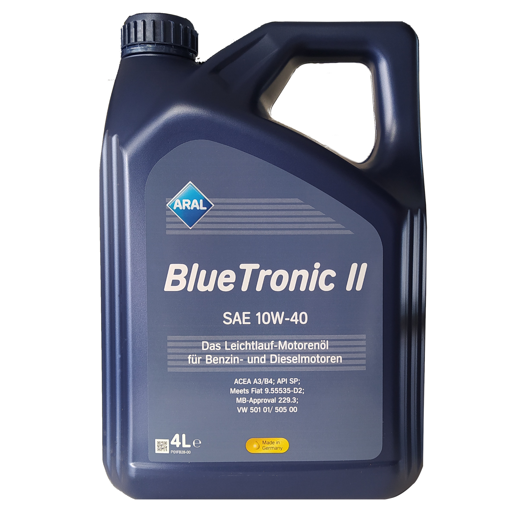 Λάδι κινητήρα χαμηλής τριβής με τεχνολογία σύνθεσης Aral. Το Aral BlueTronic II SAE 10W-40 μπορεί να χρησιμοποιηθεί σε βενζινοκινητήρες και πετρελαιοκινητήρες (συμπεριλαμβανομένων των υπερτροφοδοτούμενων κινητήρων) που είναι εγκατεστημένοι σε επιβατικά αυτοκίνητα και ελαφρά επαγγελματικά οχήματα.