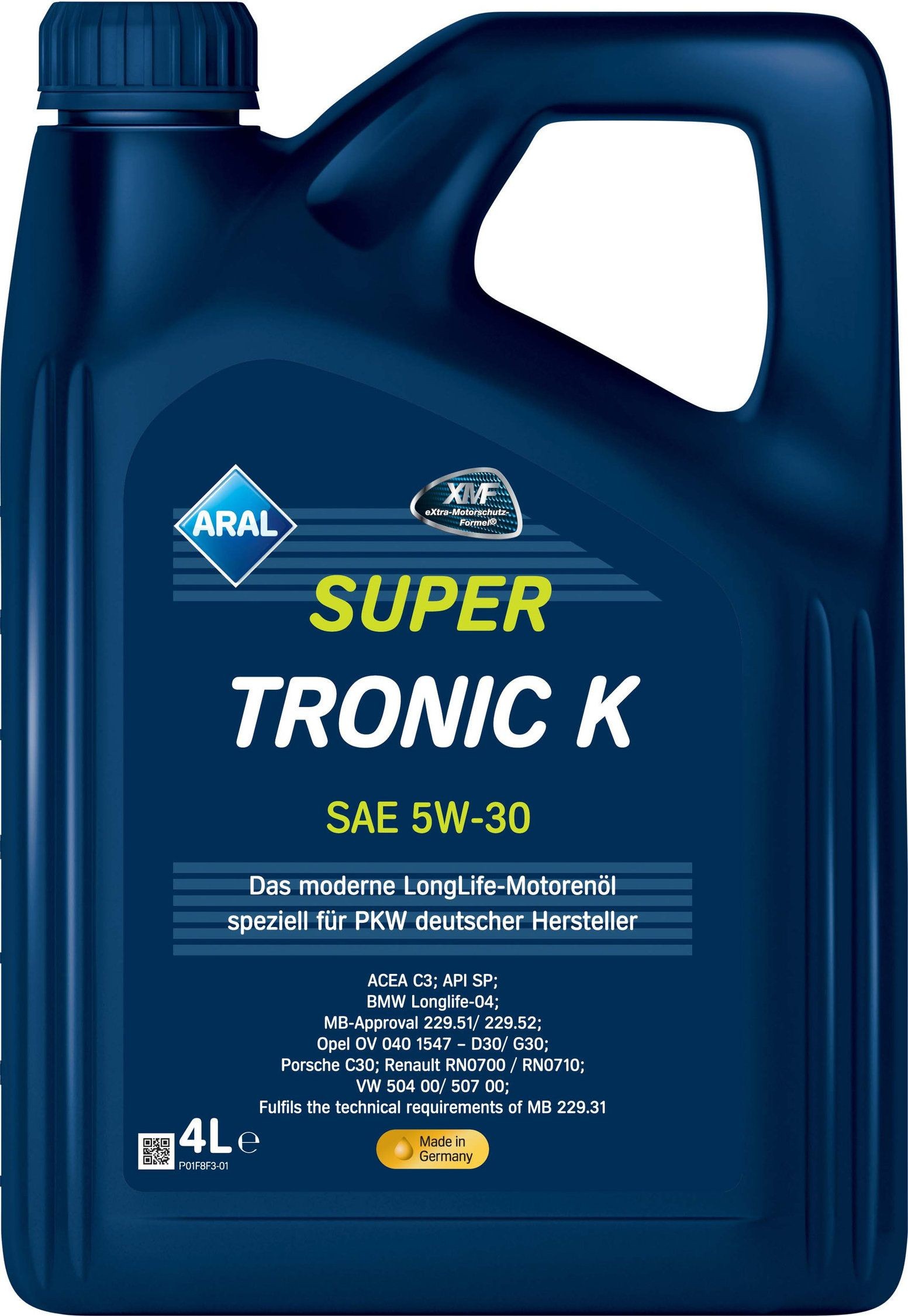Το Aral SuperTronic K 5W-30 είναι κατάλληλο για χρήση σε βενζινοκινητήρες και πετρελαιοκινητήρες αυτοκινήτων όπου ο κατασκευαστής συνιστά λιπαντικό ACEA C3, API SP 5W-30.